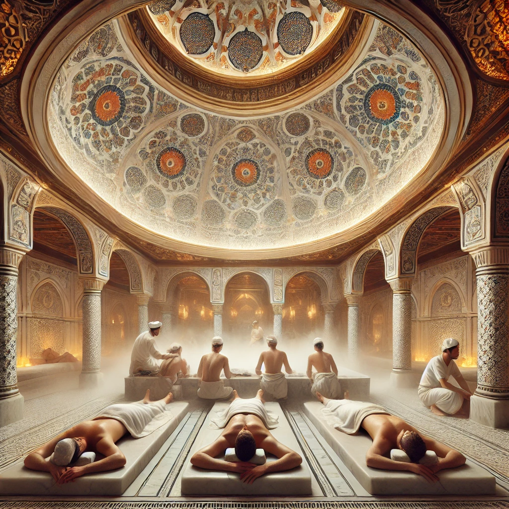 DALL·E 2025 02 17 16.25.54 A traditional Turkish Hammam with an elegant marble interior warm steam filling the air and intricate tile patterns on domed ceilings. Several men a