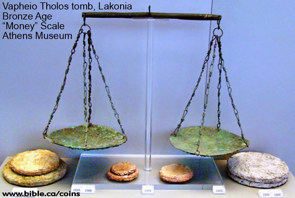 bible coins history money weight system Athens Vapheio Tholos tomb Lakonia Bronze Age Scale